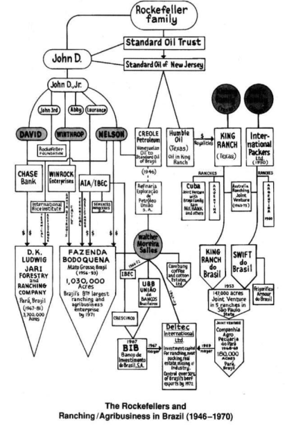 The Klebergs also maintained close connections to the Rockefeller clan. In the early 1930s, drilling rights on the property of King Ranch were given to Humble Oil, which (as mentioned earlier), was operating as a subsidiary of Standard Oil. Nelson Rockefeller himself toured the ranch with Richard Kleberg – and later, when the Office of the Coordinator of Central American Affairs (CIAA) – headed by Nelson Rockefeller – began to draft a plan for the industrial development of Brazil’s Amazonian basin, the political capital of Richard Kleberg was marshaled in support. The program, headed by future CIA figure Col. J.C. King, soon erupted into a long and bloody ordeal – written about in harrowing detail by Gerard Colby and Charlotte Dennett’s Thy Will Be Done: The Conquest of the Amazon – that would nonetheless ultimately pay off for the Klebergs. In 1968 they opened a 180,000 acre ranch in the country.