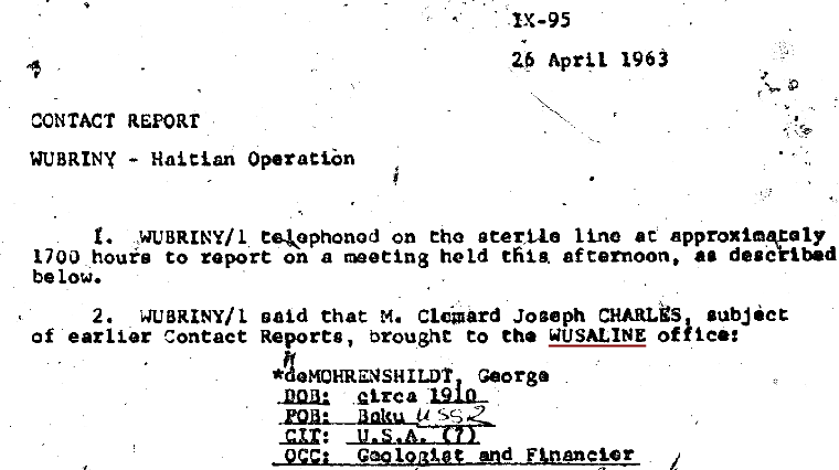 In April 1963, Mohrenschildt was brought into contact with a CIA officer code-named WUBRINY-1 by his prospective business partner, the Haitian banker Clemard Joseph Charles. The real name of WUBRINY-1 was, in fact, Thomas J. Devine, who a decade prior had helped H.W. Bush set up Zapata Petroleum Corporation – which allegedly lent its oil rigs to the CIA to be used as listening posts in their anti-Castro operations. Devine, subsequently, would go on to become a partner at the New York consulting firm Train, Cabot, and Associates.