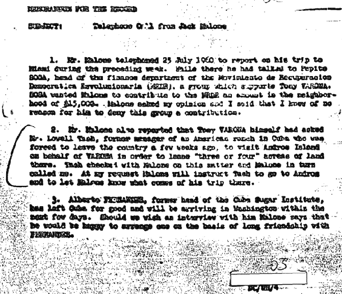 The CIA cable describes Varona and Malone meeting personally to discuss the potential acquisition of land on Andros Island (the largest island in the Bahamas). Malone then requested the CIA’s permission to dispatch Lowell Tash, the Kleberg ranch manager, to Andros to inquire about the purchase of ‘three or four acres’. The results of Tash’s endeavor are unknown, but Andros Island does become a recurring motif across a variety of anti-Castro ops. One FBI file suggests a potential link between Andros and the International Anti-Communist Brigade run by Frank Sturgis by reporting that he “is going to move the members of his secret army from the Miami area to a base of operations somewhere in the Caribbean area” with the aid of “an almost unlimited amount of money from a very wealthy Cuban” (one wonders if this is one of the Braga brothers). The file also notes that Sturgis may have deposited arms caches on Andros – a suggestion that resonates with an earlier CIA file listing Andros as a potential location for storing weapons. Earlier still, the FBI reported that Orlando Bosch – later implicated in the bombing of Cubana Flight 455 and perhaps the assassination of Chilean diplomat Orlando Letelier – intended to establish a training base and arms caches on Andros.
