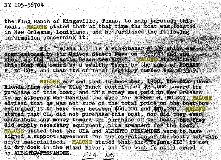 To return to Malone and the CIA: the July 25th, 1960 cable also mentions that Albert Fernandez, formerly the head of the Cuban Sugar Institute and a close associate of the Bragas brothers of Malone, had recently left the island. Malone offered to broker an introduction between Fernandez and the Agency – and soon Fernandez, operating as head of the Unidad Revolucionario (UR), would be a CIA contact with the cryptonym AMDENIM-1. A few months later, in November 1960, Fernandez approached Malone “to ask assistance of Czarnikow-Rionda and the King Ranch of Kingsville, Texas, to help purchase [a] boat” located in New Orleans – the Tejana III. In December, the Bragas and the Klebergs put up $38,000 dollars – roughly half the cost – for the purchase of the ship. Shortly thereafter, the CIA would provide armaments and shielding for the Tejana, and it would be docked at JMBAR, an Agency maritime operations base located in Key West.
